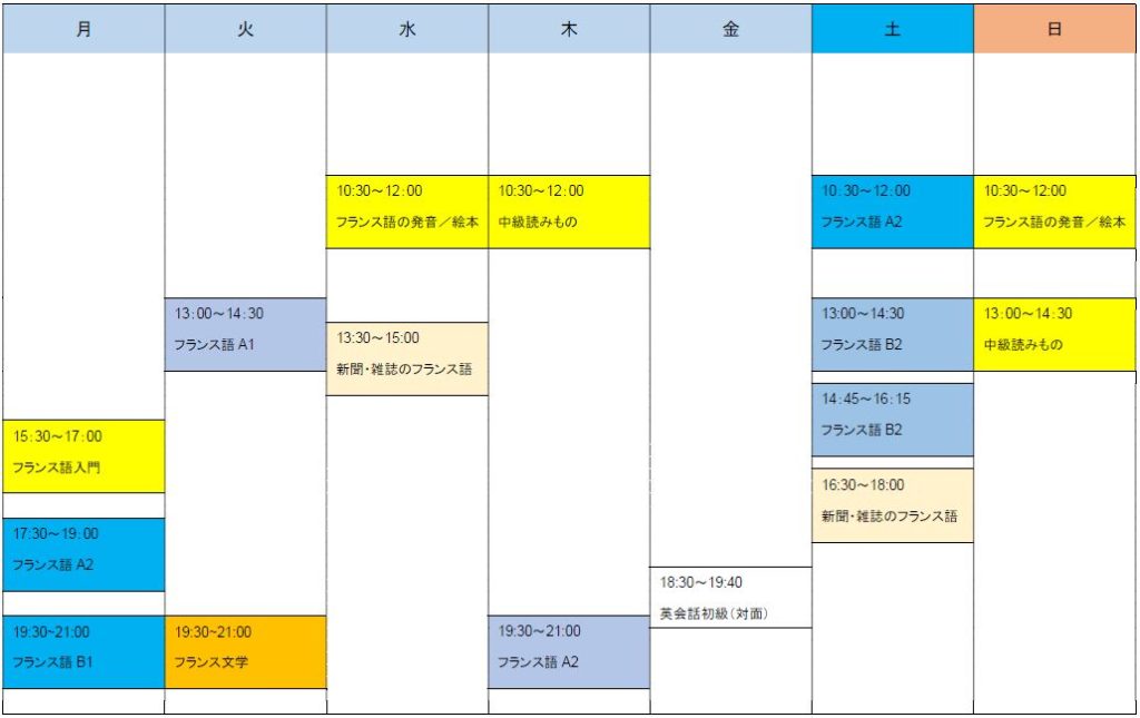 フランス語オンライン講座の現在の時間割は添付画像のとおりです。どの授業も無料体験授業ができます(Zoomを使用します)。「フランスの絵本を読む」、「フランス語の発音」、「中級読みもの」などは隔週の授業です。黄色の授業はまだ生徒がいません。興味がある方はお問い合わせください。 pic.twitter.com/ofNV9GEpyE
